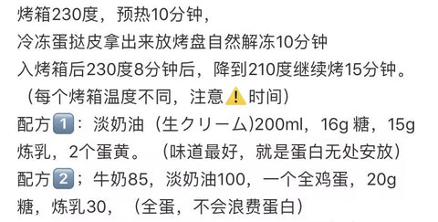 冷凍蛋撻皮拿出来放烤盘 常温解冻10分钟烤箱設置230°预热10分钟或以上蛋撻放入已经预热好的烤箱后230°8分钟后烤箱温度设置改为210°继续烤15分钟